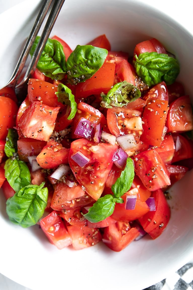 Made with garden-fresh tomatoes, spicy red onions, delicious sweet basil, and an easy three-ingredient balsamic dressing, this Tomato Basil Salad takes just 10 minutes to prepare from start to finish.